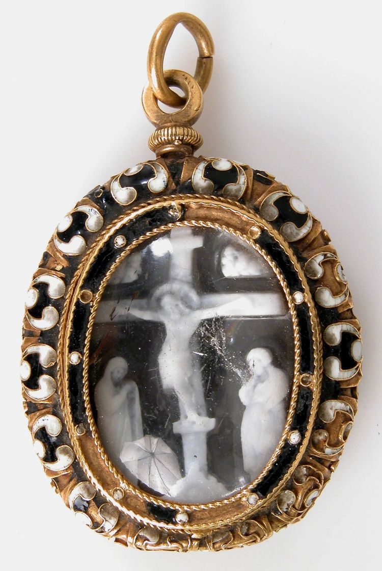 Кулон, внутри которого можно видеть распятого Иисуса Христа, Деву Марию и Святого Иоанна, возможно Франция, 14 век