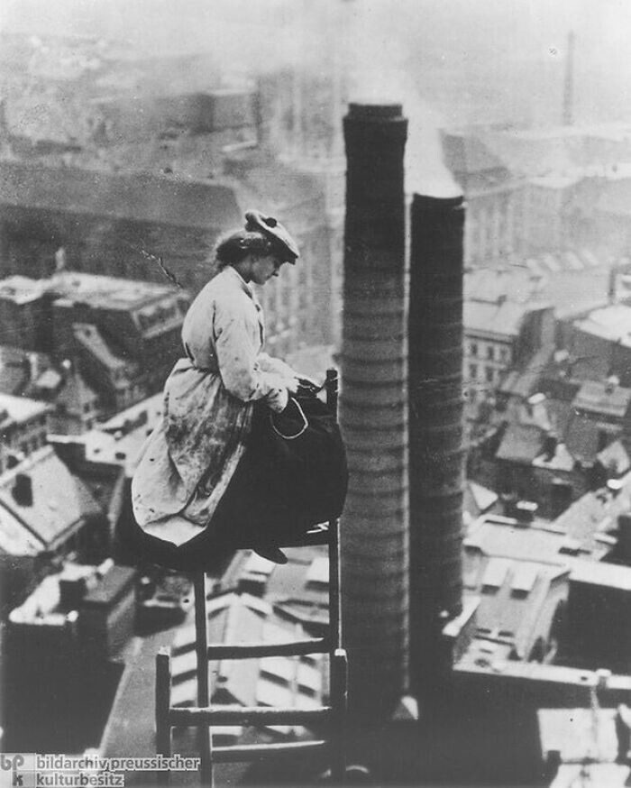 С ростом индустриализации количество немок, работающих вне дома, также выросло. Обычно это была работа на заводе, но в некоторых семьях, владеющих собственным бизнесом, дочери также обучались ремеслу, чтобы помогать: выше мы видим дочь мастера-каменщика во время ремонтных работ на башне старой ратуши в Берлине.