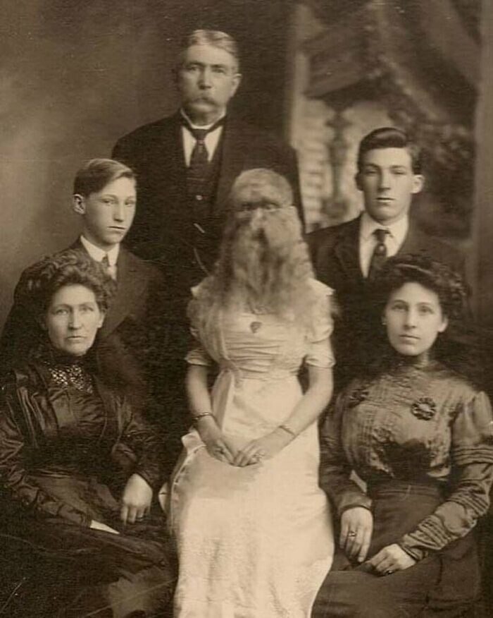14. Элис Доэрти — «шерстяная девушка из Миннесоты» — позирует со своей семьей на типично мрачном викторианском портрете начала 1900-х годов