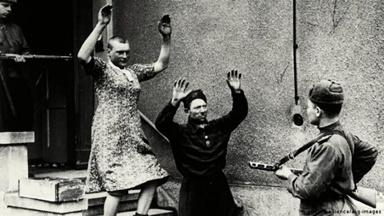 Красноармейцы берут в плен немецких солдат, один в женском платье. Берлин. Май 1945 года. Фото Анатолий Морозов
