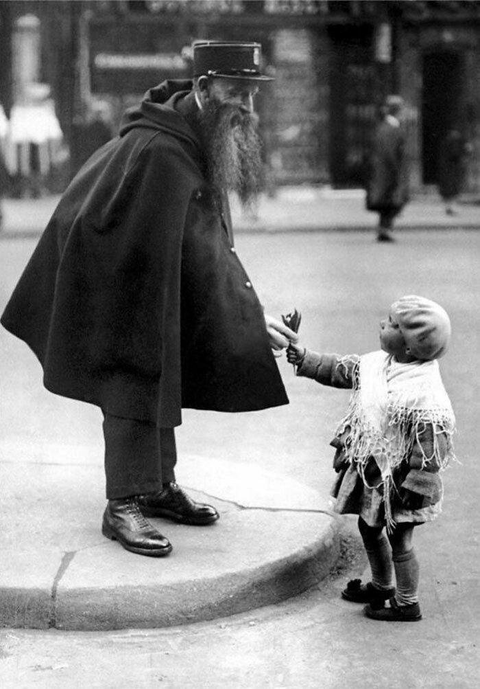 1929. Маленькая девочка вручает лилии дежурному полицейскому у ворот Сен-Дени в Париже