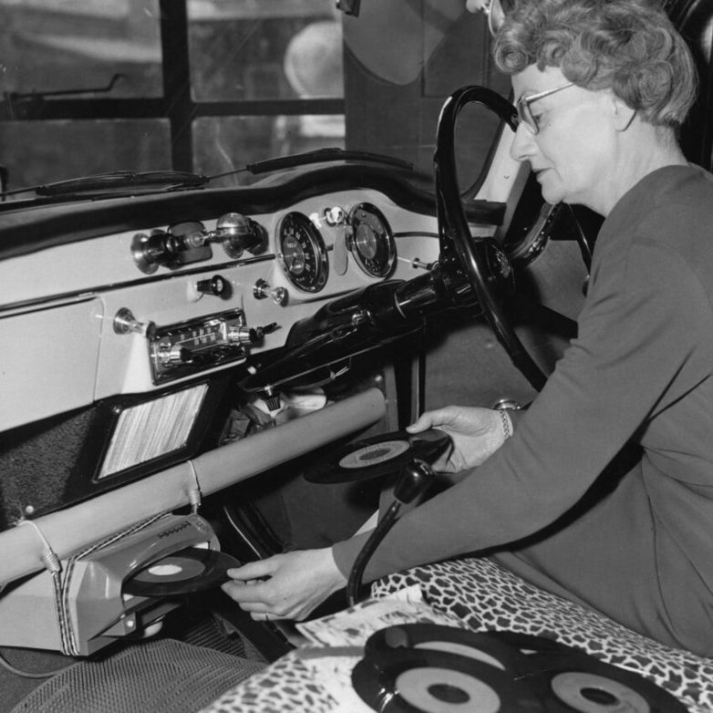 Женщина меняла пластинки на своем проигрывателе Philips в машине ещё в 1959 году