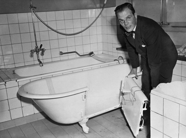 Пер Бергманн с гордостью представляет своё последнее изобретение, цель которого — облегчить пожилым людям и инвалидам вход в ванну и выход из неё. К сожалению для Пера, наличие двери в ванной приводило протечкам. Швеция, 1953 год