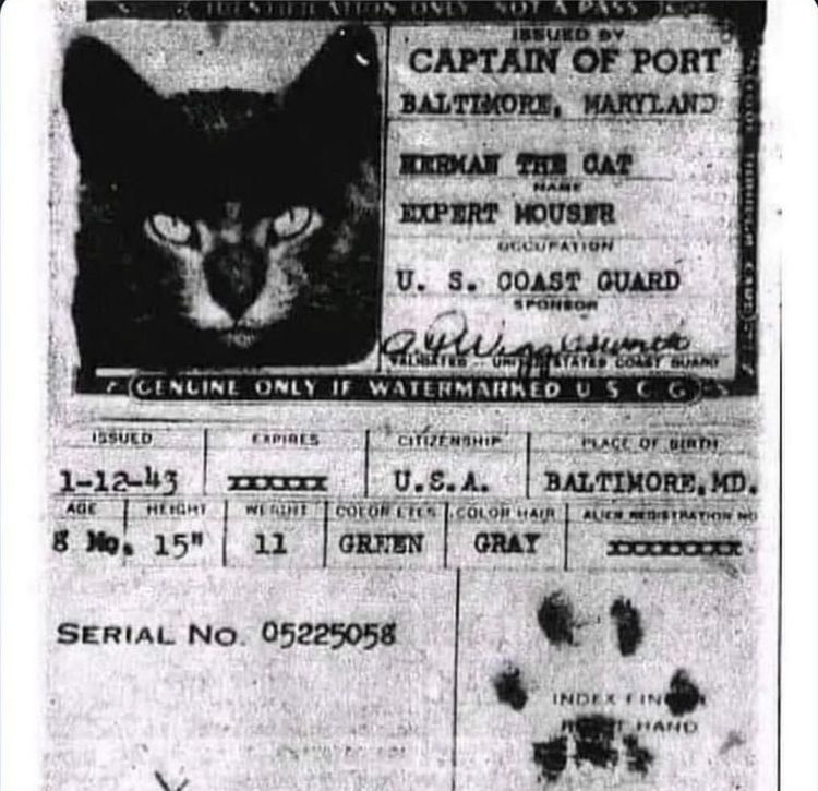 Кошки, которые плавали на кораблях до середины 20-го века, чтобы ловить грызунов, имели собственные паспорта, подписанные отпечатками их лап. Этот был выпущен 1 декабря 1943 года