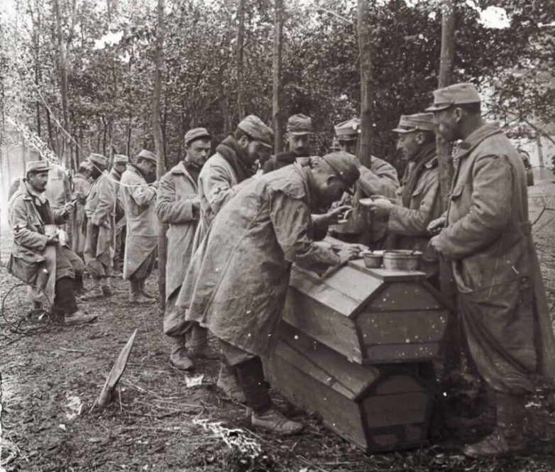 Французские солдаты обедают на гробах. Первая мировая война