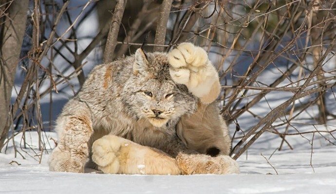 1. Канадская рысь «зависла» с огромной лапой наверх во время умывания, как делают и домашние кошки