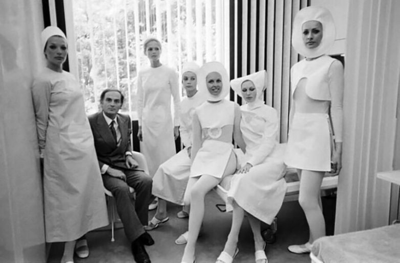 Модельер Пьер Карден позирует с моделями в своем футуристическом видении униформы для медсестер в Париже, Франция, 1970-е год