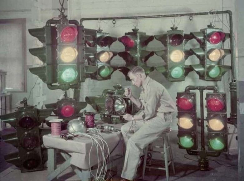 Производство светофоров в Шривпорте (штат Луизиана), откуда они отправляются в города США и за рубеж, декабрь 1947 год