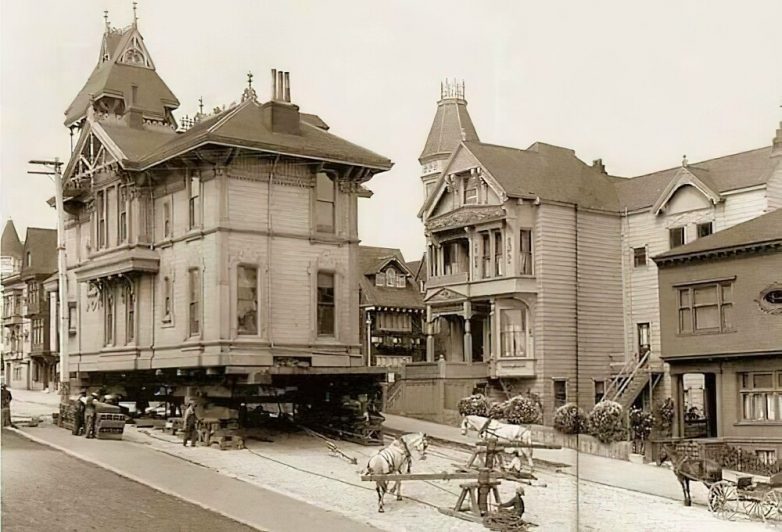 Викторианский дом передвигают на лошадиной тяге, Сан-Франциско, 1908 год