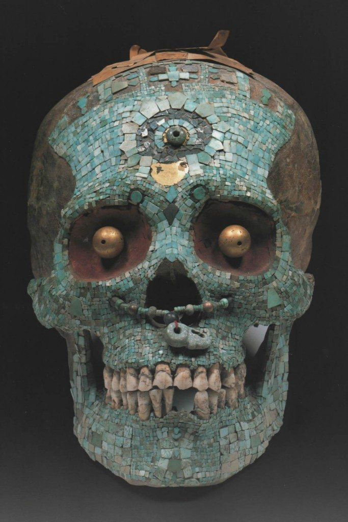 Ацтекский череп, инкрустированный бирюзовой мозаикой и золотыми глазами