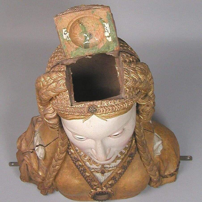 В этом хранился череп святой женщины (не скажу какой именно), а лючок в верхней части головы деревянной скульптуры давал доступ к мощам. Стеклянное оконце-медальон на груди фигуры открывало вид на дополнительную реликвию. Изготовлено в Нидерландах, 1520-1530.
