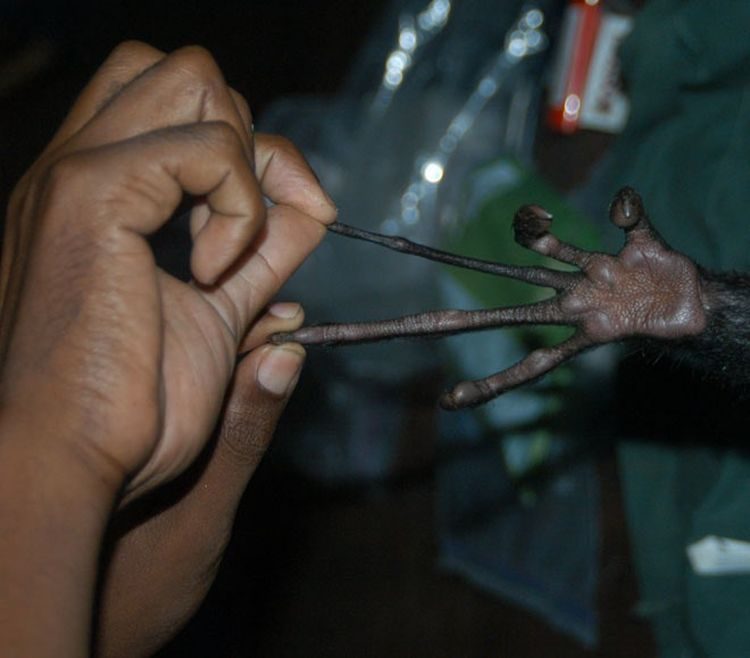 На среднем пальце руки два последних сустава длинные, тонкие и не покрыты волосами. Руконожка пользуется этим пальцем, чтобы простукивать древесину в поисках полых мест и извлекать из трещин коры жуков и других насекомых