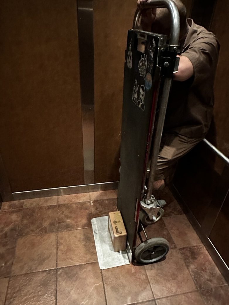 4. Сотрудник службы доставки использует тележку для крохотной посылки