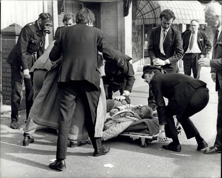 18 мая 1973 года. Олдхэм, Англия. Финал осады дома, где засел неадекватный мужик с пистолетом и сломанной ногой. После применения газа CS, мужика уносят на носилках.