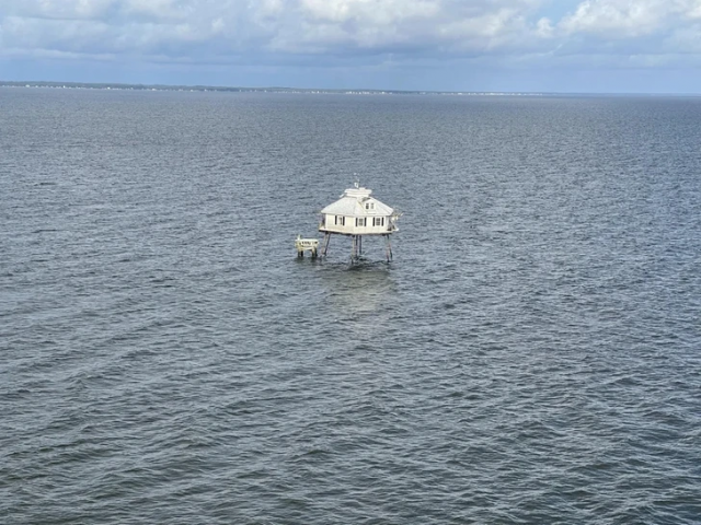 Это старинный, но все еще действующий маяк. Он расположен в Алабаме, в центре залива Мобил.