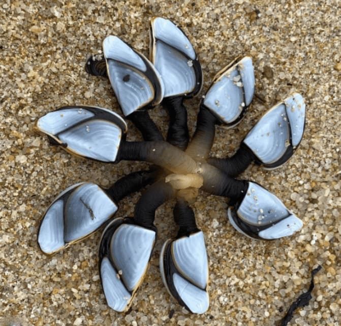 Морские уточки — удивительные существа, которые не являются моллюсками. Они — усоногие рачки. Передвигаются эти создания с помощью лапок (отростков). Их вы и можете видеть на фотографии.