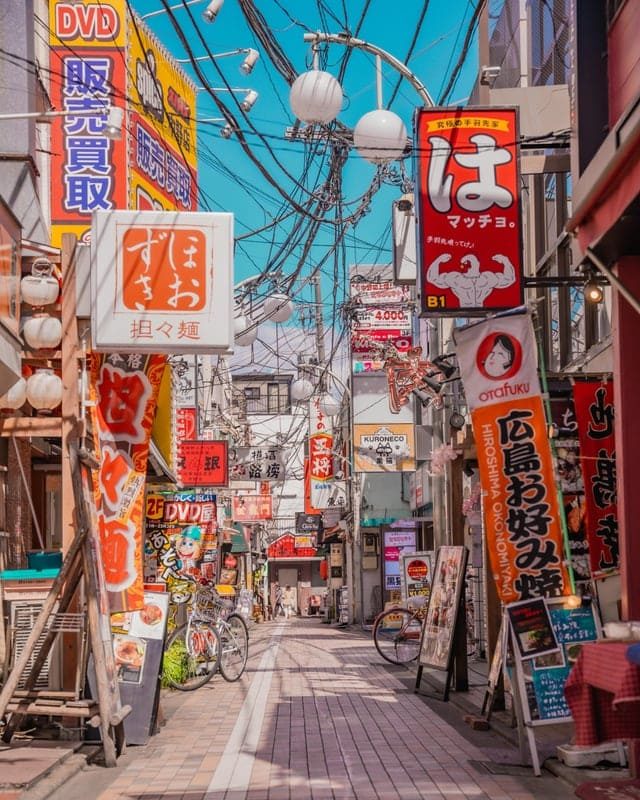 Токио, улица Хакусан и голубое небо за рекламой и проводами