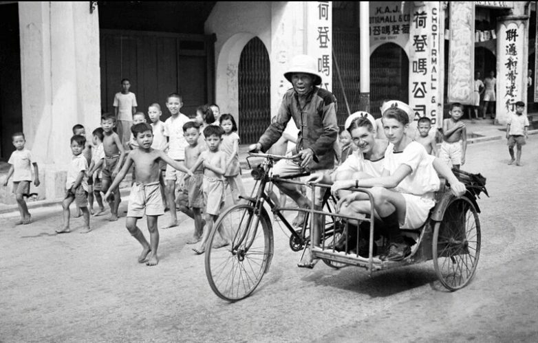 Два британских матроса на велорикше осматривают «красоты» города. Сингапур 8 сентября 1945 года