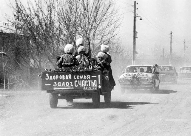 Свадебный кортеж едет по улице туркменского поселка, 1972 год, Туркменская ССР