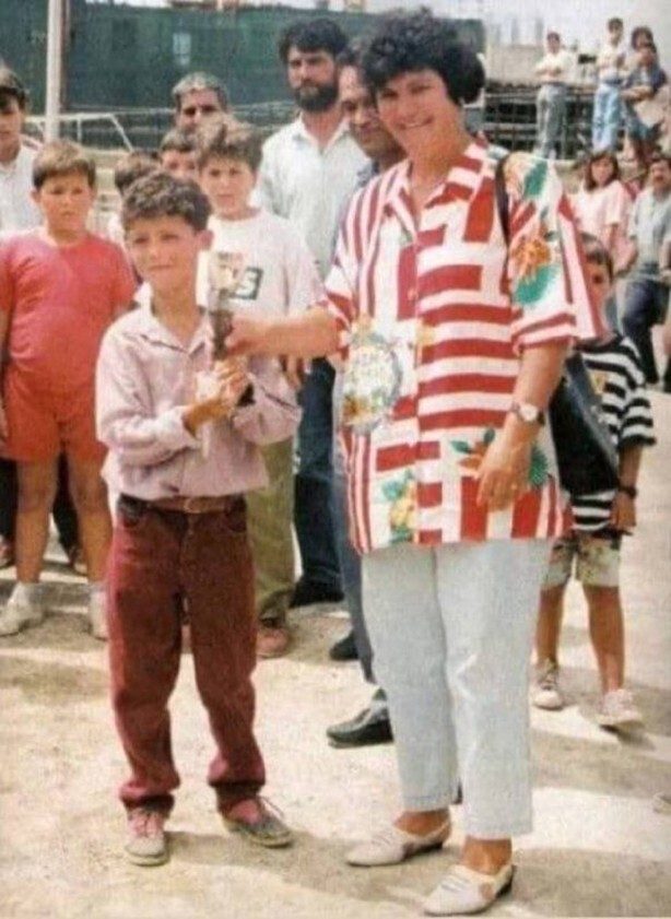 Совсем юный Криштиану Роналду делает фото на память с одной из первых наград стоя со своей мамой.