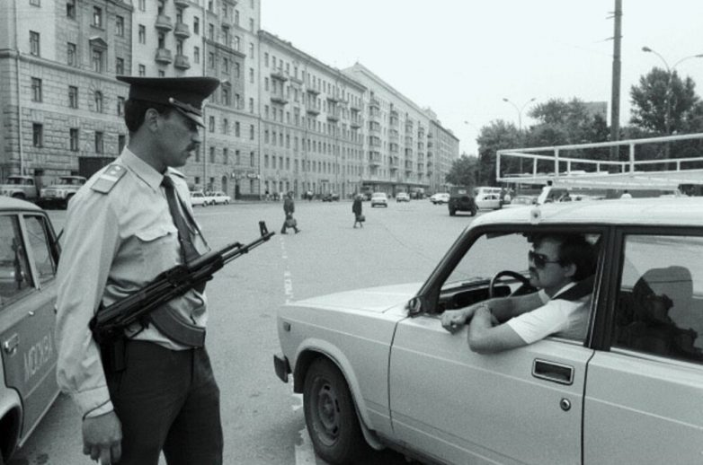 Сотрудник ГАИ с автоматом на посту у Павелецкого вокзала. Москва, 1992 год.