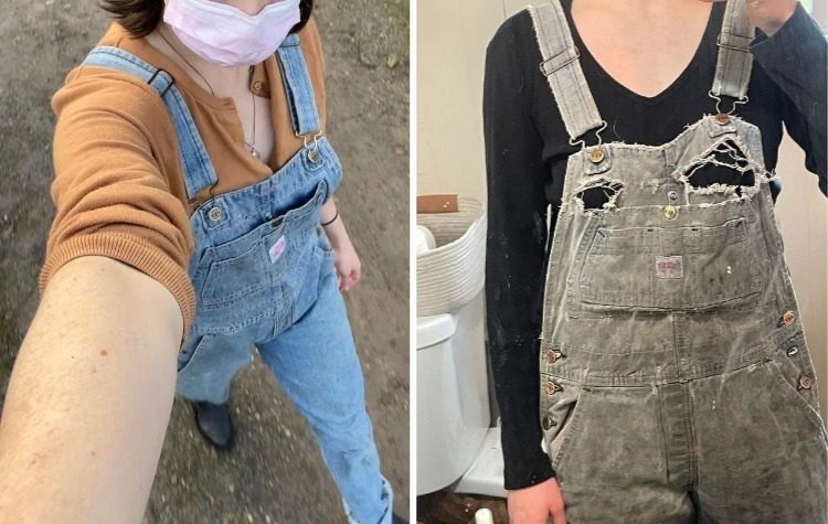 «Мой рабочий комбинезон, когда я взяла его в секонд-хенде в ноябре 2020-го по сравнению с апрелем 2023-го»