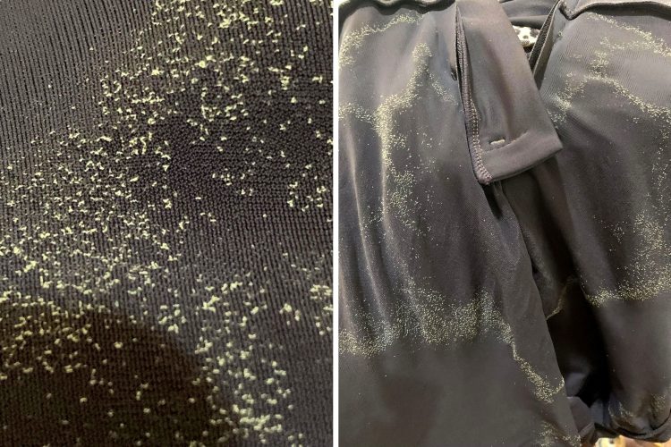 Вопрос: «Желтоватый порошок на внутренней стороне моих купальных шортов. Он не смывается даже после многократных стирок. Немного отрывается при чистке, но я чищу уже час, и почти не добился никакого прогресса. Это только с внутренней стороны, с другой стороны все чисто. Что это такое? Это экскременты насекомых? Грибок?»