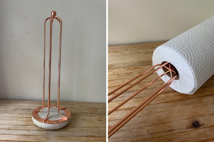 Вопрос: «Думал, что это держатель для бумажных полотенец, но диаметр для них слишком велик. Деревянная круглая подставка, на которой металлический круг медного цвета с пятью ребрами высотой около 30 см, объединенных небольшим шаром наверху»
