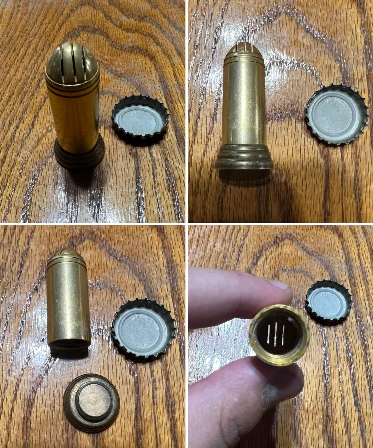 Вопрос: «Я получил этот предмет в качестве свадебного подарка от египетского гостя на свадьбе. Он почти 13 см в высоту и имеет съемную верхнюю часть с 4 маленькими отверстиями, как у солонки (предмет не полый). Существуют также непонятные соединения с какими-то целями. Я полагаю, что штампы на предмете — это штамп серебра 900 пробы и, возможно, дата»