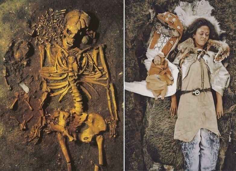 Рядом с головой женщины лежали 200 зубов благородного оленя, а тело ребёнка покоилось на крыле лебедя, в районе бедра находился кремневый нож. Археологи полагают, что мать и ребёнок умерли сразу после родов.