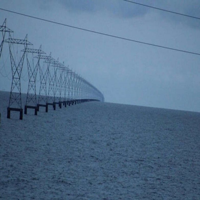 Линии электропередач на озере Пончартрейн, штат Луизиана, США, просто и ясно демонстрируют шарообразность Земли