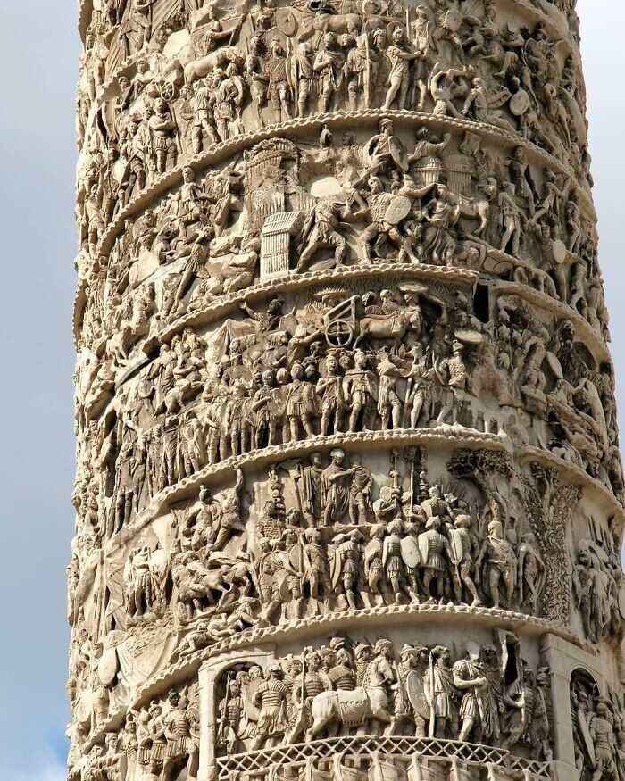На памятнике изображены сложные сюжетные барельефы в память о Маркоманской войне Марка Аврелия.
