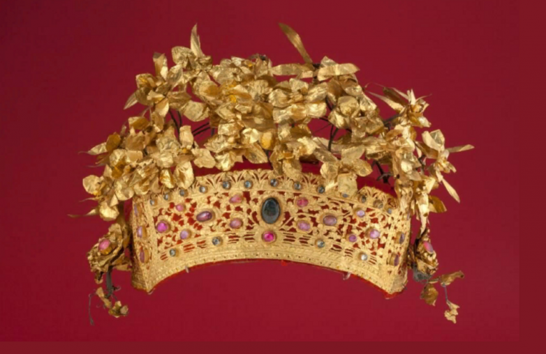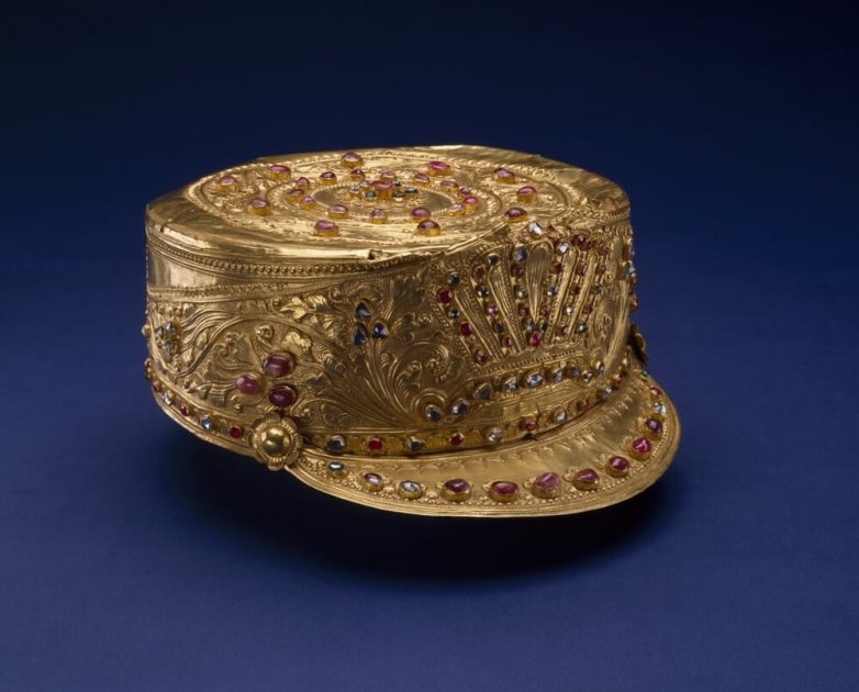 Золотая корона, похожая на кепку-жириновку, была изготовлена в 1890 году. Венец украшен рубинами, сапфирами и алмазами.