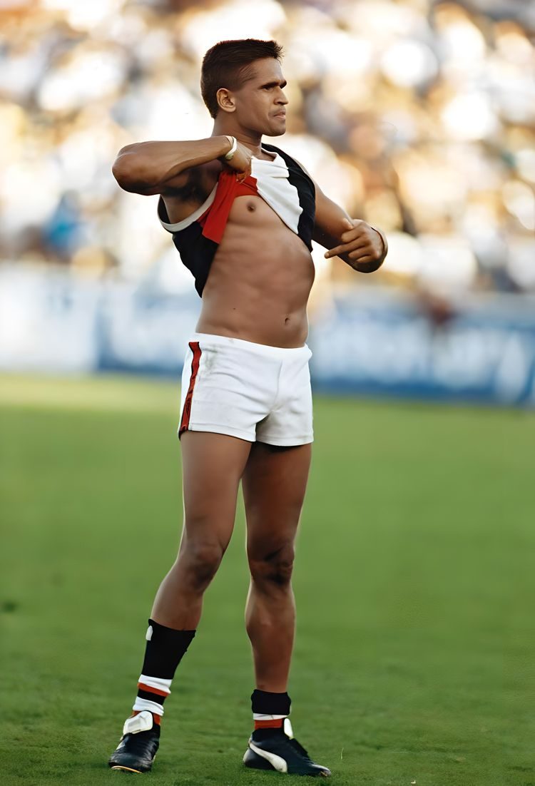 Австралийский футболист-абориген Ники Уинмар с гордостью указывает на свою кожу после того, как столкнулся с расистскими оскорблениями во время игры, 1993 год