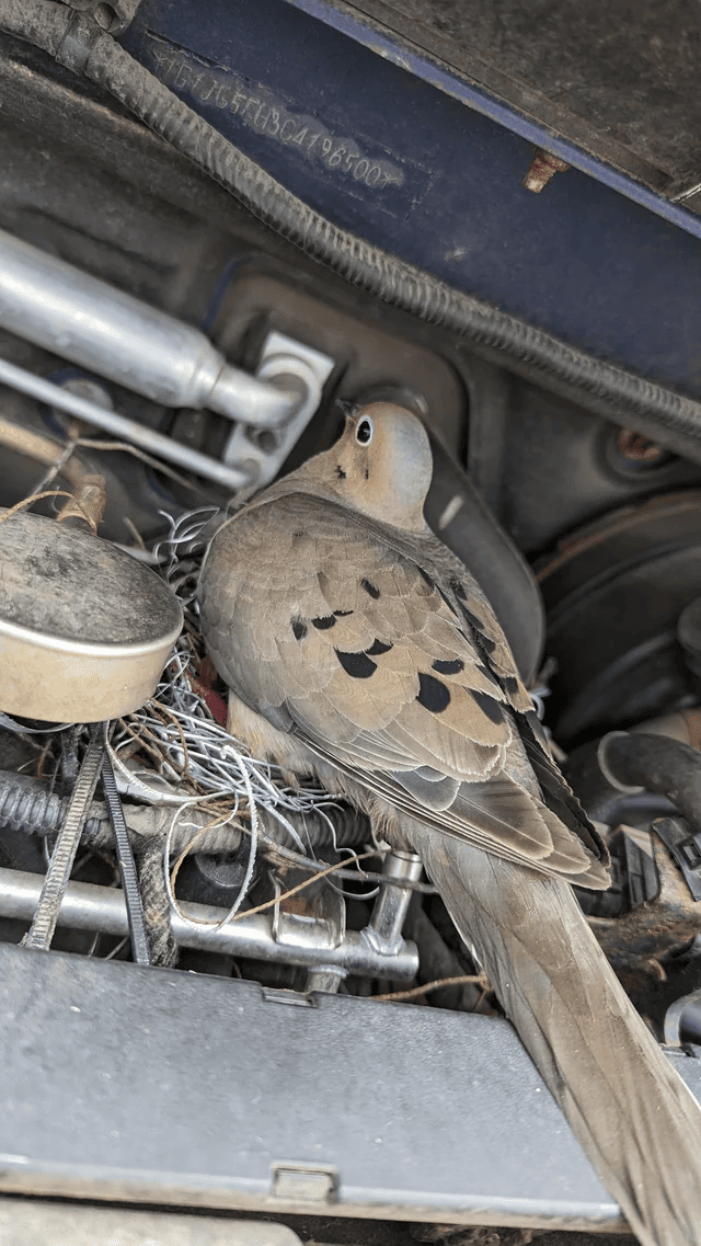 Голубь, высиживающий яйца в металлическом гнезде
