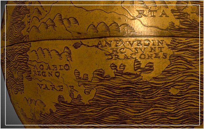 Это одна из двух средневековых карт или глобусов эпохи Возрождения, на которых, как известно, есть знаменитый девиз Hic Sunt Dracones, или «Здесь будут драконы». В средневековой картографии картографы использовали такие фразы для обозначения неизведанных или опасных территорий, пробуждая воображение предприимчивых душ мифическими зверями и неизведанными чудесами. Сегодня же эта фраза ассоциируется в основном с неизвестным, но возможно, первоначально она относилась к драконам Комодо, населяющим часть Индонезийского архипелага.
