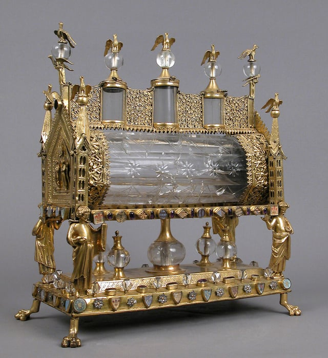 Необычный французский реликварий, сделанный из ценных металлов и горного хрусталя, 1175-1200 годы