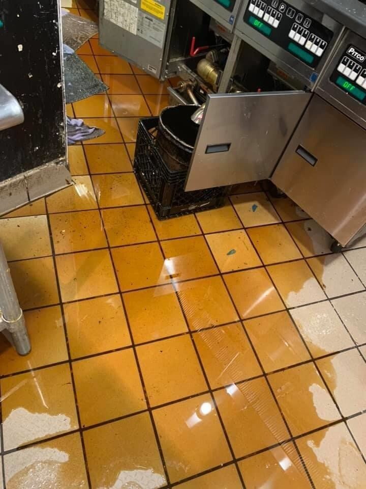 6. Новый парень попытался вылить жир из фритюрницы в пластиковое ведро