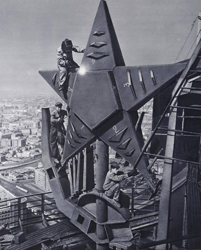 Монтаж звезды на шпиле высотного здания на Котельнической набережной. Москва, 1951 год