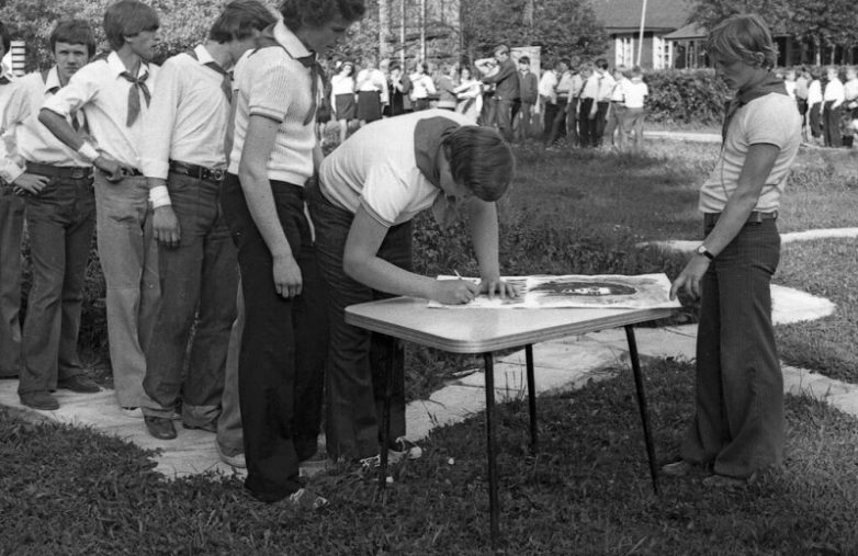 Первый отряд подписывает письмо протеста к американскому президенту. Фото Павел Сухарев, август 1976 года, Московская обл., дер. Бутынь.