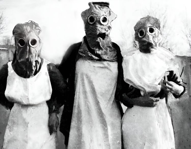 Медсестры Красного Креста в противогазах, помогающие солдатам, страдающим «испанкой», 1918 год
