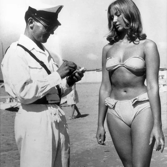 По современным меркам, больше похоже на мини-платья. Но теперь перенесёмся ещё через 7 лет вперёд в Италию на пляж в Римини и на следующем фото увидим, как сеньор полицейский выписывает женщине штраф за ношение… бикини.