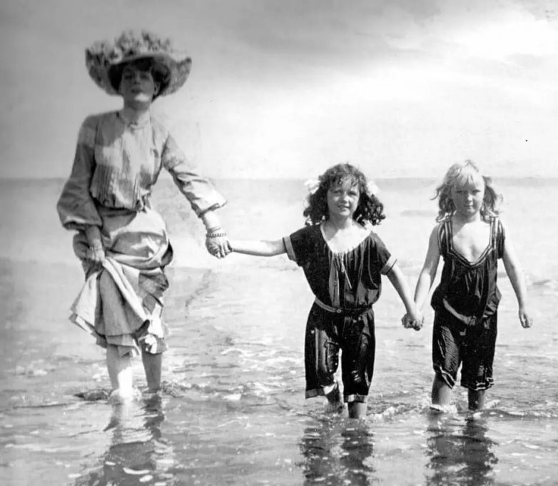 На следующем фото 1905 года женщина «купается» с детьми. Она и вовсе в платье и шляпке просто бродит на мелководье, но даже девочки лет 5-7 с ней почти в полностью закрытых купальных костюмах.