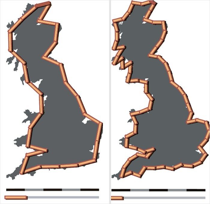 14. Существует парадокс береговой линии: невозможно точно измерить длину береговой линии страны, и чем точнее измерение, тем больше становится длина — вплоть до бесконечности