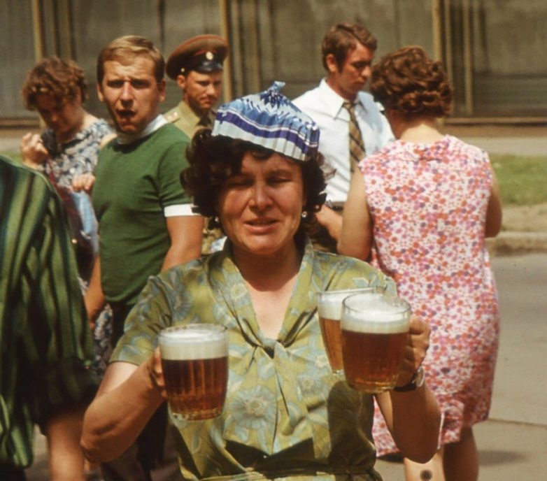Женщина несет три кружки свежего пива из киоска на пляж Днепра в городе Запорожье, 1972 год