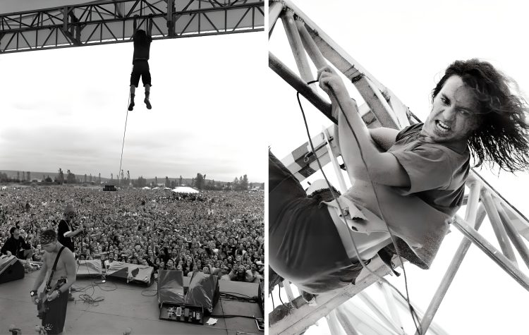 Концерт группы Pearl Jam и её фронтмен Эдди Веддер, висящей на стропилах, 1992 год