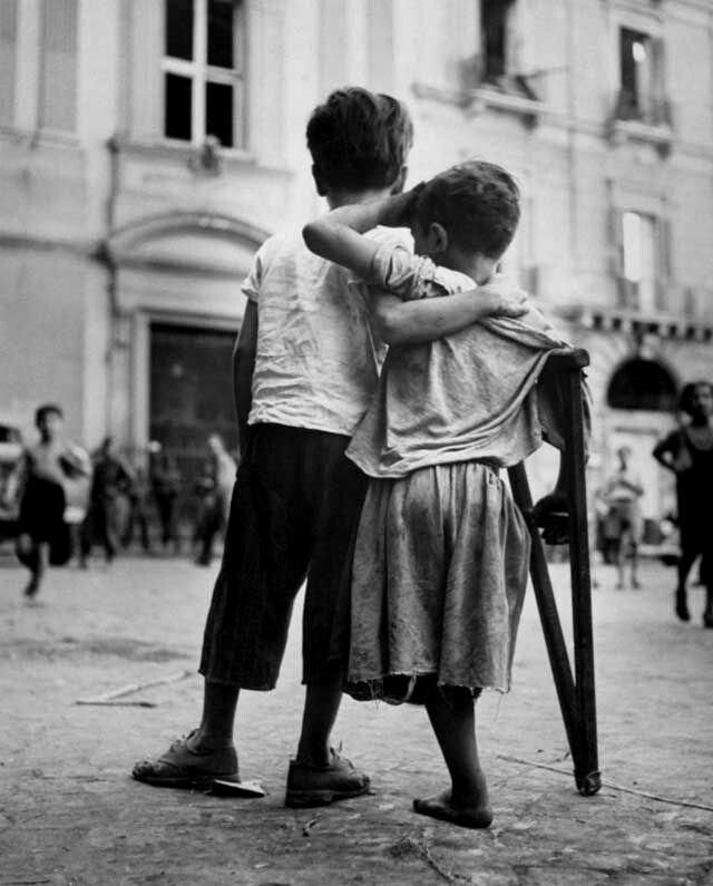 Мальчик помогает своему младшему брату, потерявшему ногу во время бомбардировки Неаполя. Италия, 1944