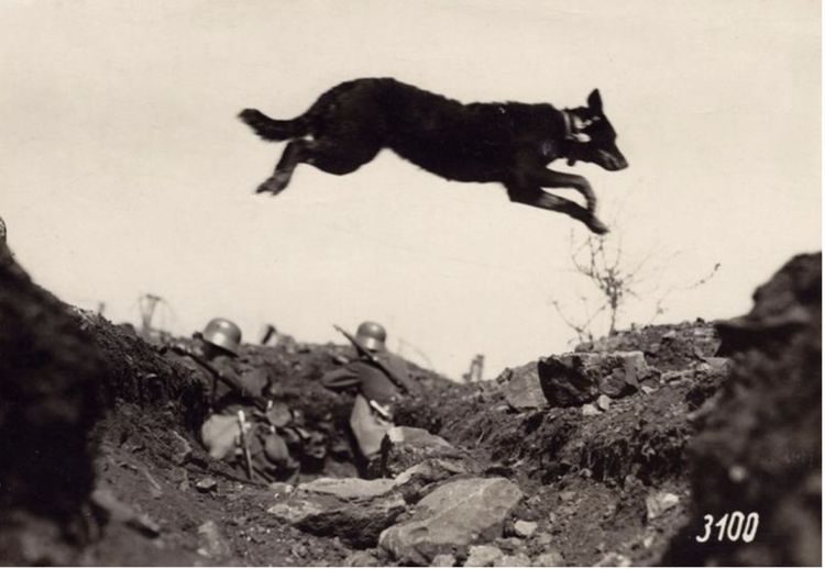 Собака-посыльный перепрыгивает через немецкую траншею во время Первой мировой войны, 1915 год