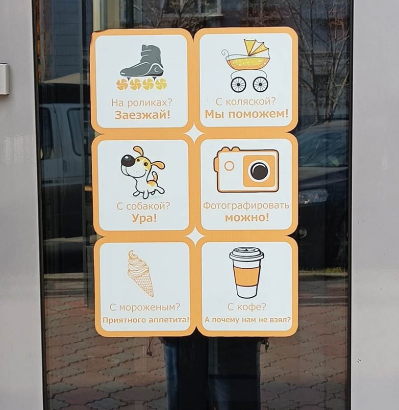 Они рады всем посетителям и поэтому сделали такую табличку на входе