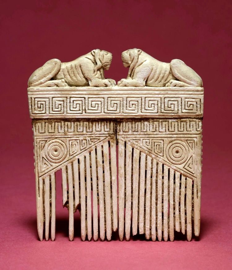 Древний этрусский резной гребень из слоновой кости с двумя скульптурами льва, ок. VI век до нашей эры